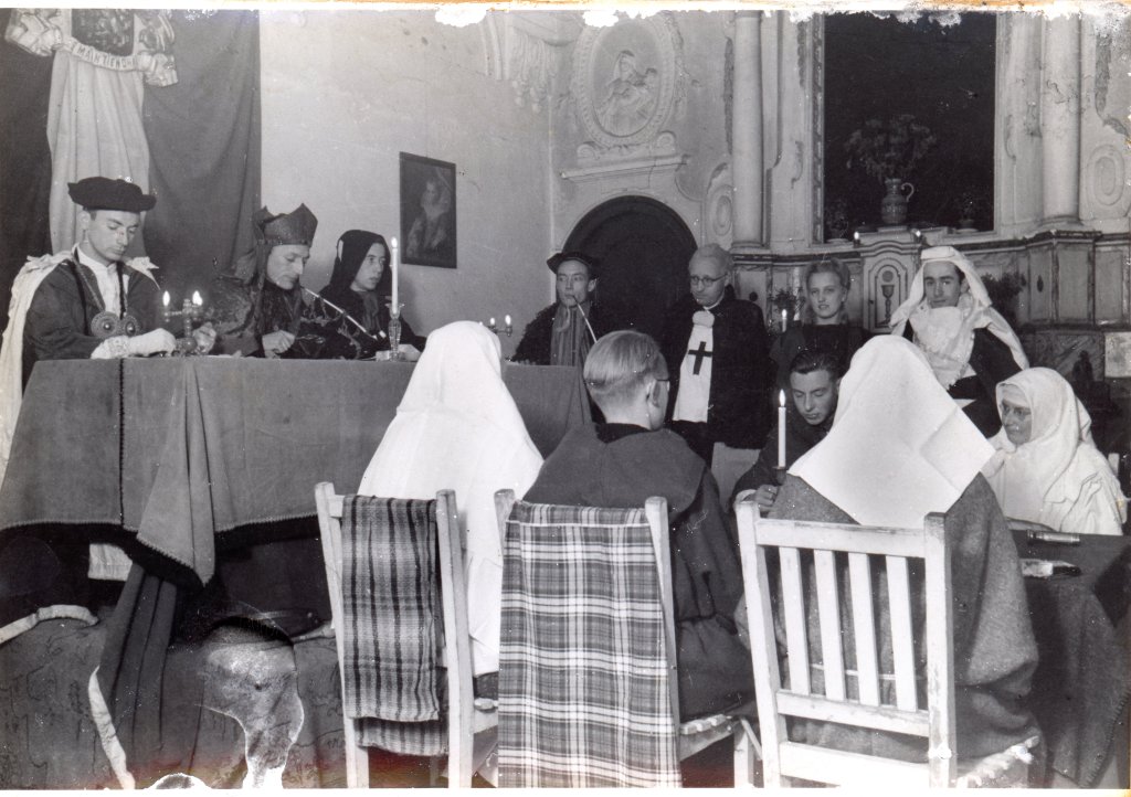 De volgende twee foto’s zijn gemaakt bij het tweede Groot Concilie van het Prinsenklooster, een jaar na de bovenstaande foto. In december 1941 komen alle bewoners (en een aantal bezoekers) weer bijeen in de kapel van het hofje. Ook nu verkleed in (geïmproviseerde) religieuze gewaden. Bijna alle bewoners die op de foto uit december 1940 staan, zijn ook op deze twee foto’s uit 1941 terug te vinden. Vica Taselaar en Bram Kuiper komen allebei in januari 1942 op het hofje wonen. Zij stellen zich bij deze gelegenheid voor en worden als nieuwe onderhuurders lid van de Orde van het Prinsenklooster. Zij staan allebei op deze twee foto’s die aan een grote tafel onder het “orgel” in de kapel van het Nieuwe Suikerhofje gemaakt werden. Een andere nieuwe bewoonster is Britta Hudig, misschien staat zij ook op de foto.