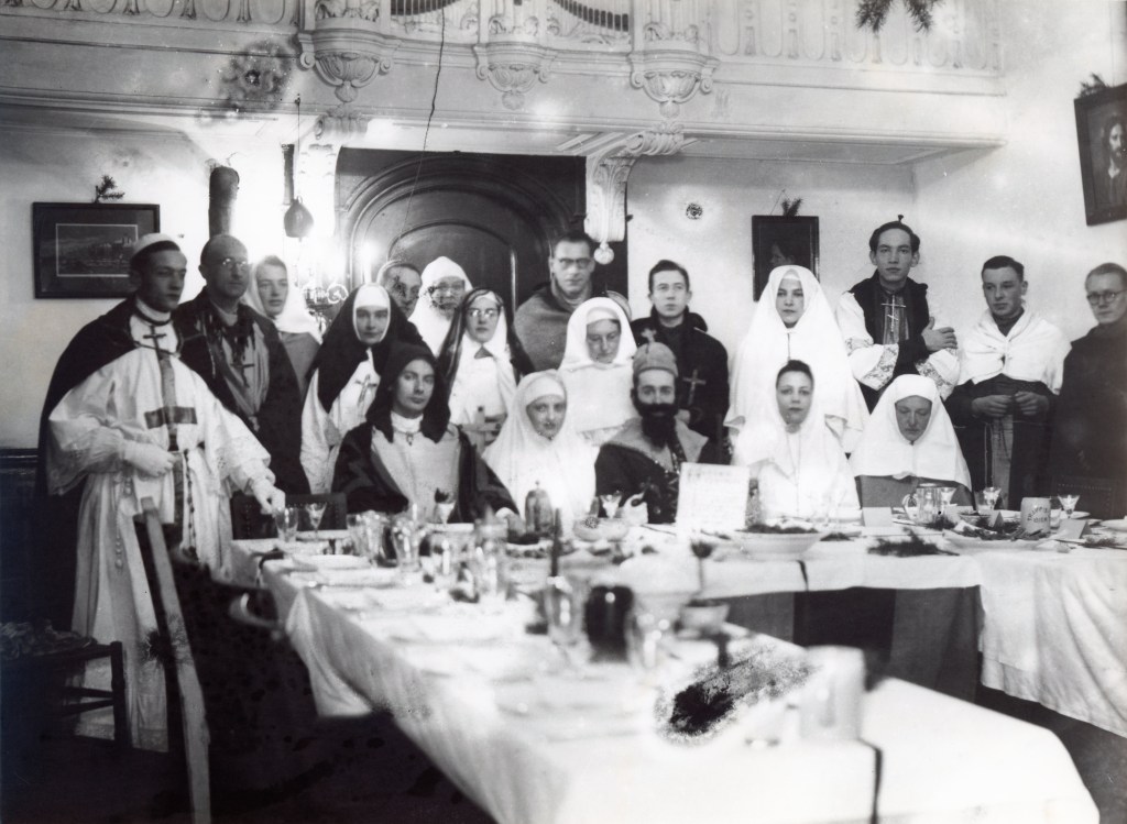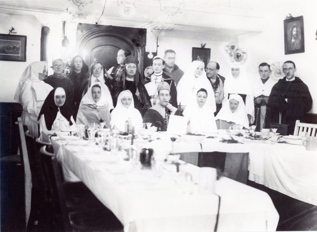 De drie hoofdhuurders Herman, Henk en Emile stichten de Orde van het Prinsenklooster, met bijbehorend reglement (huurregels) en rituelen (feesten). Eens per jaar in december komen alle bewoners samen in de kapel voor het Groot Concilie -tegelijk Kerstfeest- waarbij het afgelopen jaar doorgenomen wordt en nieuwe leden in de Orde (nieuwe onderhuurders) plechtig bevestigd worden. Van de Groot Concilies van december 1940 en 1941 zijn foto’s bewaard gebleven. Helaas is niet van alle mensen op deze foto’s bekend wie het zijn. Vooral van de vrouwen op de foto’s ontbreken de namen. Lotta Clara Hudig woont vanaf april 1941 op het hofje. Waarschijnlijk staat zij op deze foto. De verpleegsters Alida Silver en Willy Gutteling huren in 1941 ook. Het is niet bekend of zij op onderstaande foto van december 1940 staan.