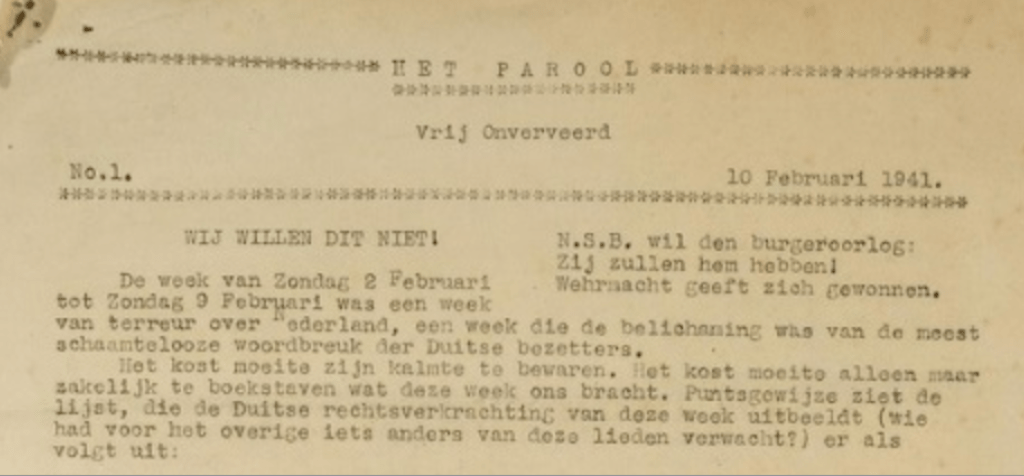 Koos Vorrink, de vroegere voorman van de SDAP, is de koersbepalende politicus binnen de Paroolgroep. Deze groep ziet zich al snel niet meer alleen als de redactie van een illegaal nieuwsblad maar ontwikkelt bredere verzetsaspiraties. Medebepaling van de koers van Nederland na de bevrijding staat hoog op de agenda. De leden van de Paroolgroep zoeken contact met de Nederlandse regering in Engeland via in Nederland gedropte agenten, die naar Engeland kunnen zenden, en proberen een koeriersdienst naar het buitenland op te zetten.