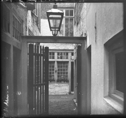 Door de spijlen zijn links, rechts en rechtdoor bakstenen huisjes van drie verdiepingen te zien, die hoger lijken dan ze zijn omdat de steeg zo smal is. (3) Het is duidelijk dat er niemand meer woont, het hofje staat al een tijdje leeg. De laatste bewoonsters verlieten het in de loop van 1937. Begin 1940 woont er een paar maanden een student in de kapel die achter de hofjeshuizen staat, maar die verhuist na de bezetting van Nederland op 15 mei 1940 terug naar zijn geboorteplaats Haarlem. (4)