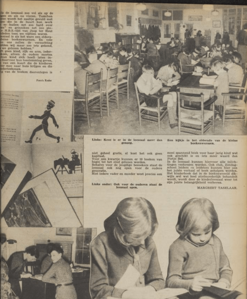 De kinderleeszaal van de Maatschappij tot Nut van het Algemeen is in de Wijdesteeg, vlak achter de Dam. Kinderen kunnen er zelf boeken uit de rekken pakken, voor die tijd iets heel moderns. Ook zijn er voorleesmiddagen voor arme Jordanese kinderen. De directrice Louise Boerlage, tante Wies genoemd door haar medewerkers, heeft deze nieuwe ideeën opgedaan in de VS. De jonge vrouwen die ze als assistentes aanneemt vormen een hecht team. Behalve Margreet en Annie M.G. Schmidt zijn dat Annie Moerkercken van der Meulen en de Joodse Els van Dien-Hendrix. (2)