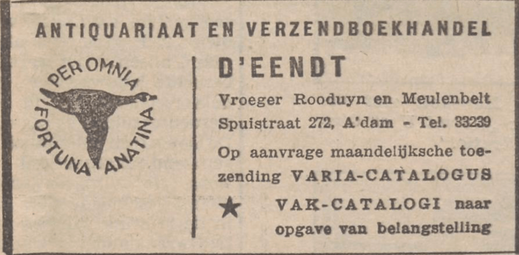 Waarschijnlijk halen de bewoners van het hofje in deze latere fase van de bezetting ook distributiebonnen op in het antiquariaat D’Eendt (een verwijzing naar onderduiken, eenden duiken onder water) op de Spuistraat 272. In dat hoekpand begint de student geologie Karel Louis de Vries (1918-2008), die nauwe contacten met de mensen op het Nieuwe Suikerhofje heeft, een distributiesysteem voor bonkaarten. (24) De Vries zit op de zolder van de boekwinkel. Bij de VGA (Vrije Groepen Amsterdam) aangesloten verzetsgroepen kunnen bij hem distributiebonnen voor hun onderduikers halen. De Vries’ zwager, Hans Rooduijn, was het antiquariaat in de loop van 1943 begonnen. Hij had eerst een verzendboekhandel in Utrecht, waar hij in verzetskringen rond het Utrechts Kindercomité verkeerde. (25)